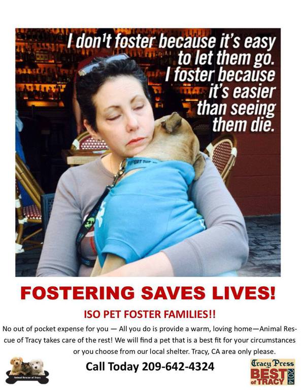 Would you like to provide a safe, loving, temporary home to a dog or cat in need? Animal Rescue of Tracy is looking for responsible and compassionate foster parents/families to provide immediate lodging and love for a rescued pet…or two.